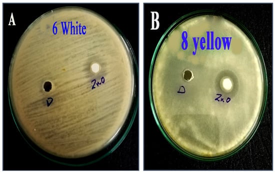 Zinc oxide nanoparticles have good antifungal activity against many funguses, such as Candida albicans, Aspergillus niger, and Pestalotiopsis maculans [9], as Table 3 and Figure 8A,B reveal. Zinc oxide nanoparticles which are synthesized by association with Chlorella vulgaris, have a strong effect against both isolates of A. flavus with azole resistance. The inhibition zone of A. flavus isolated from white maize is 14 nm, while, zinc oxide nanoparticles have less effect on A. flavus isolated from yellow maize. Similarly, the minimal inhibitory concentration of zinc oxide nanoparticles against Azole-resistant A. flavus isolated from yellow corn (25 vs. 50 mg/mL) is higher than that of white corn.