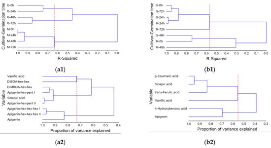Cluster analysis further confirmed the distinct behavior of BRS Guaraim and BRS Marcante concerning the changes in phytochemicals during germination. Cluster analysis revealed that wheat cultivars were grouped into three groups according to the free phytochemical variables during germination (Figure 1(a1)), explaining 63.3% of the data variation. BRS Marcante was grouped into a single group regardless of the germination time (M-0 h, -24 h, -48 h and -72 h), whereas BRS Guaraim was divided into two groups: one for 0 and 24 h (G-0 h and -24 h) and the other for 48 h and 72 h (G-48 h and -72 h). Cluster analysis of the free phytochemical variables (Figure 1(a2)) also revealed three groups, which were able to explain 73% of the data variation. One of these groups included vanillic acid and DIBOA-hex-hex, another group was composed of DIMBOA-hex-hex, apigenin-hex-pent I and II and sinapic acid, and the last one was composed of apigenins hex-hex-hex I, II and aglycone.