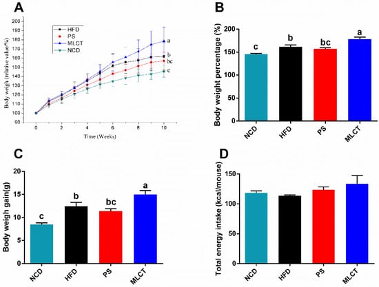 Body weight gain and energy intake. (A) Body weight of mice over 10 weeks. (B) Body weight gain percentage. (C) Body weight gain. (D) Total energy intake. In (B,C), means with the different lowercased letters differ significantly (p < 0.05) according to one-way ANOVA analysis followed by Tukey’s tests.