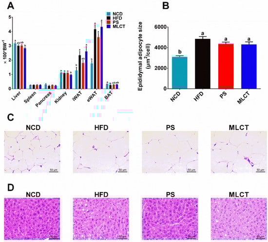 Organ indexes and morphological changes. (A) The weight percentage of organs. (B) Adipocyte size of eWAT (n = 6). (C) H&E staining of eWAT. (D) H&E staining of liver tissues. In (B), means with the different lowercased letters differ significantly (p < 0.05) according to one-way ANOVA analysis followed by Tukey’s tests.