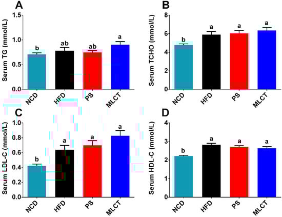Generally, the changes in serum lipids are closely related to the body weight. The level of lipid metabolism is reflected by the four serum lipids (TG, TC, LDL-C, and HDL-C) [24]. Figure 3A indicated that only MLCT significantly increased the TG level in comparison with the NCD group. In addition, no significant differences among the HFD, PS, and MLCT groups were found. As shown in Figure 3B–D, compared to the NCD group, the three groups (HFD, MLCT, and PS) exhibited significant increases in three parameters (TCHO, LDL-C, and HDL-C), whereas no differences were observed among these groups. All these results suggest that dietary intake of MLCT has little influence on regulating serum lipid metabolism.