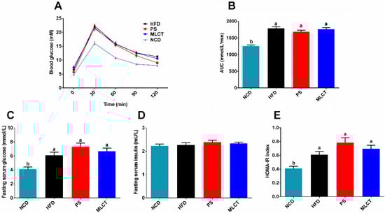 Effects of MLCT on glucose homeostasis. (A) Glucose tolerance test (GTT). (B) Area under curve (AUC) from GTT. (C) Fasting serum glucose. (D) Fasting serum insulin. (E) HOMA-IR. Data were shown as mean ± SE (n = 8). In (B,C,E), means with the different lowercased letters differ significantly (p < 0.05) according to one-way ANOVA analysis followed by Tukey’s tests.