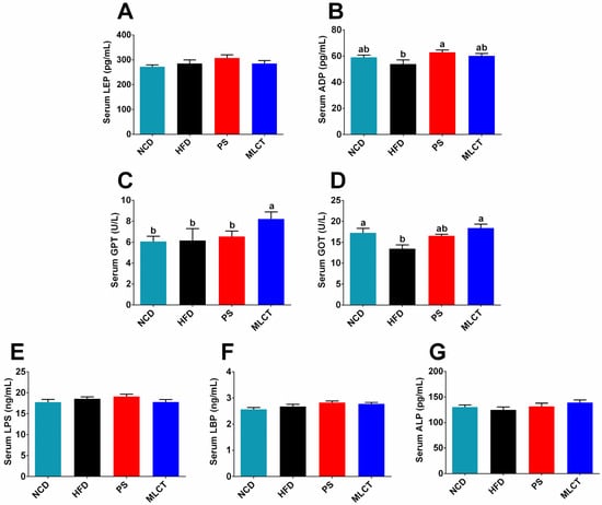 Effects of MLCT on serum hormones and cytokines. (A) LEP. (B) ADP. (C) GPT. (D) GOT. (E) LPS. (F) LBP. (G) ALP. Data were shown as mean ± SE (n = 8). In (B–D), means with the different lowercased letters differ significantly (p < 0.05) according to one-way ANOVA analysis followed by Tukey’s tests.