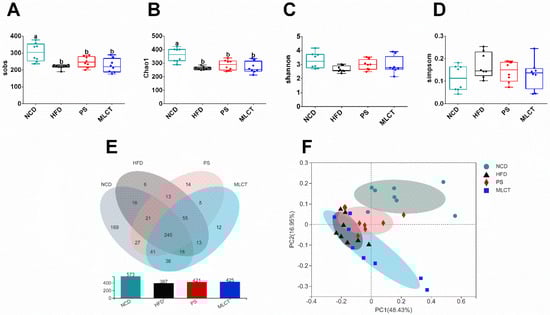 Effects of MLCT on diversity of the gut microbiota. (A) Sobs. (B) Chao1. (C) Shannon. (D) Simpson. (E) OTUs Venn Diagram. (F) PCoA plot (weighted UniFrac distances). Data were shown as mean ± SE (n = 8). In (A–D), means with the different lowercased letters differ significantly (p < 0.05) according to one-way ANOVA analysis followed by Tukey’s tests.