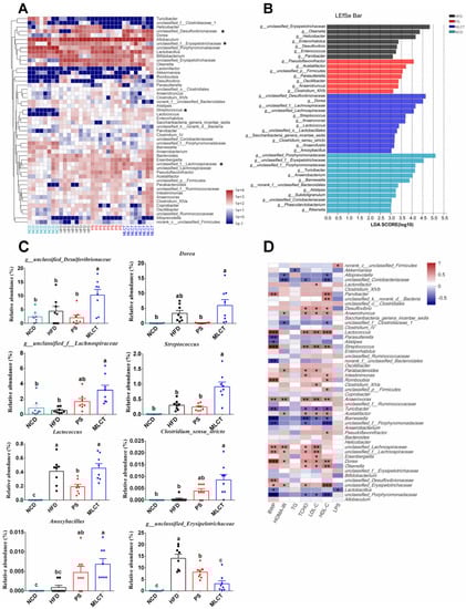 Effects of MLCT on the gut bacteria composition. (A) Heatmap analysis on genus level (the relative abundance of OTUs > 0.25%); (B) The LEfSe analysis (LDA > 3.0). (C) The relative abundance of g_unclassified_f_Desulfovibrionaceae, Dorea, g_unclassified_f_Lachnospiraceae, Streptococcus, Lactococcus, Clostridium_sensu_stricto, Anoxybacillus, and g_unclassified_Erysipelotrichaceae. (D) Correlations between intestinal microflora and biochemical indicators. In (A), p < 0.05 marked with “*” compared with HFD group. In (D), p < 0.001 marked with “***”, p < 0.01 marked with “**”, p < 0.05 marked with “*”. In (C), means with the different lowercased letters differ significantly (p < 0.05) according to one-way ANOVA analysis followed by Tukey’s tests.