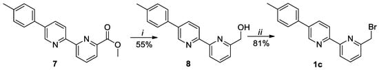 Synthesis of 6-bromomethylbipyridine (1c). Reagents and conditions: (i) NaBH4/EtOH, 78 °C, 4 h; (ii) PBr3/CH2Cl2, 50 °C, 2 h.