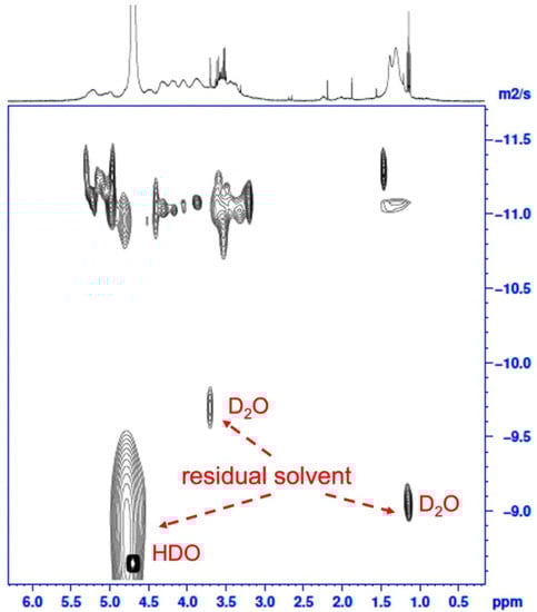 The AdSP in the present study is a natural polysaccharide with a broad molecular mass distribution and a variable monosaccharide arrangement, which could be concluded from the previous studies discussing the diversity of Arthrospira-derived polysaccharides [25]. The molecular weight (Mw) distribution of AdSP was confirmed through high-performance size-exclusion chromatography with refractive-index detection (HPSEC-RI), as shown in Figure S2 (Supplementary Materials). The AdSP presented a single-peak distribution with an average molecular weight of ~272 kDa, indicating the high homogeneity of the polysaccharide. Although there could be reasonable variations in the structure of AdSP, the purity of the polysaccharide should be clarified. As an attempt to decipher the structure of AdSP and confirm its purity, two-dimensional diffusion-ordered spectroscopy (DOSY), along with classic nuclear magnetic resonance spectroscopy (1H NMR), was employed, and the results are shown in Figure 1. From the classical 1H NMR (upper part of Figure 1), the arrangement of the monosaccharides of AdSP appeared to be promiscuous, so that the characteristic peaks overlapped considerably, which made it unlikely to justify a specific structure. However, the purity of the AdSP was verified by DOSY, excluding the effect of the residual solvent (D2O and HDO, as shown in Figure 1). The structural heterogeneity of AdSP may account for the irregular shape in the diffusion pattern of the DOSY result. These findings indicated that the AdSP developed in this work was a high-purity bio-sourced polymer.