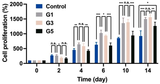 Gelatin methacryloyl (GelMA) was successfully synthesized, and the degree of substitution (DS) of GelMA was verified through 1H NMR spectroscopy (Figure S4, Supplementary Materials). The DS was about 95%. GelMA hydrogel as a biocompatible and biodegradable hydrogel matrix has been widely used in biomedical fields [26]. Moreover, many previous works certified that GelMA hydrogel was a good supporting matrix for cell proliferation [27]. To examine the bioactivity of AdSP on cell behavior, three different AdSP-loaded GelMA hydrogels and a control hydrogel (GelMA hydrogel without AdSP) were produced for cell experiments, of which the component ratios and abbreviated names are listed in Table 1. The proliferation of neural stem cells (NSCs) encapsulated in hydrogel was analyzed by a Cell-counting Kit-8 (CCK-8) assay over a period of 14 days to assess the effects of AdSP on the behavior of NSCs. The results are shown in Figure 2. After 14 days, the G1 hydrogel group (with 1.0 mg/mL AdSP) and G3 hydrogel group (with 3.0 mg/mL AdSP) demonstrated a better proliferation rate of NSCs than the control hydrogel group (without AdSP) and the G5 hydrogel group (with 5.0 mg/mL AdSP). No significant difference existed between the G1 and G3 groups. All three AdSP-containing groups showed obvious promotion on the proliferation of NSCs compared to the control group. As the concentration of AdSP in the hydrogel increased, the proliferation rate of NSCs in the hydrogel did not show a completely positive correlation. When the concentration of AdSP in the hydrogel was greater than 3 mg/mL, the effect of AdSP in promoting the proliferation of NSCs in the hydrogel was reduced. Previously reported AdSP has not been investigated individually for its proliferative effects on NSCs, and only one study showed that Arthrospira exhibited some proliferative effects on human NSCs [15]. Our finding on AdSP is consistent with the latter observation on Arthrospira.