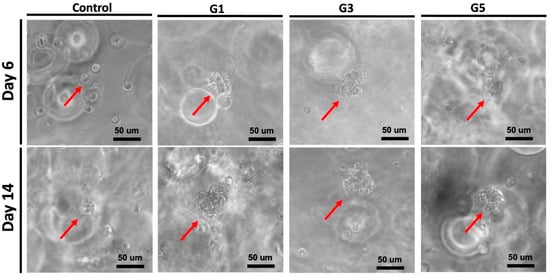 The potential clustering behavior of NSCs encapsulated in the hydrogels was observed by microscopy, as displayed in Figure 3. After 14 days, for all three AdSP-containing groups, cellular aggregation to variable extents was observed in the encapsulated NSCs. Eventually, cells were aggregated and formed multicellular spherical clusters. The average diameters of the NSC clusters in three AdSP-loaded hydrogels were ~58 μm, ~56μm, and ~39 μm for the G1 hydrogel, G3 hydrogel, and G5 hydrogel, respectively. The size of the single NSC used in this study was ~11 μm. However, the NSCs in the control group without AdSP did not show significant aggregation behavior. In the literature, AdSP has not been reported to present cell-aggregation-promoting activities. Meanwhile, such spherical clusters may have the potential to prolong stemness and maintain the multi-lineage of NSCs rather than separate cells [28,29]. Further gene expression assays were performed to verify the promotive effect of AdSP on cell behavior in hydrogel as well as its influence on gene expression.