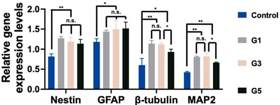 NSCs encapsulated in AdSP-loaded hydrogels and the control hydrogel (non-AdSP-containing) after a 14-day culture were investigated for their gene-expression profiles, to determine the differentiation status. The results are displayed in Figure 4. The expression levels of all genes, including the nestin (stemness marker), glial fibrillary acidic protein (GFAP, glial marker), β-tubulin (early neuronal marker), and microtubule-associated protein 2 (MAP2, mature neuronal marker) genes, showed significant differences between the AdSP-loaded hydrogels and the control group. No obvious difference existed among three AdSP-loaded hydrogels for the expression of nestin, indicating that spherical neuro-clusters probably maintain stemness longer than the the non-clustered NSCs in the control hydrogel. All AdSP-loaded hydrogels demonstrated no specific inclination for the differentiation direction of NSCs. The AdSP-loaded hydrogels tended to induce the differentiation of NSCs more toward neurons (β-tubulin and MAP2 genes) rather than glial cells (GFAP gene). This finding is consistent with the relevant literature, reporting that SP can promote neurosphere formation and may not influence the stemness and multi-lineage potential of neurospheres [30,31]. In addition, the high concentration of AdSP in the hydrogel (>5 mg/mL) decreased the expression level of neuron-related genes, though it remained higher than that of the control group. Therefore, an optimal concentration of AdSP for bioactivity on NSCs may exist, agreeing with the conclusion drawn by a cell-proliferation study. In the literature, a different type of AdSP was observed to possess possible neuro-protective effects in a Parkinsonian mouse model [32]. Arthrospira was also validated for its anti-inflammatory and inhibitory effects during the response of microglia to oxidative stress [15]. The new AdSP in this study, when in the appropriate range of concentration, can effectively promote the proliferation, spheroid formation, and differentiation of NSCs. This AdSP may, thus, be a promising candidate for the treatment of neurodegenerative diseases in the future.