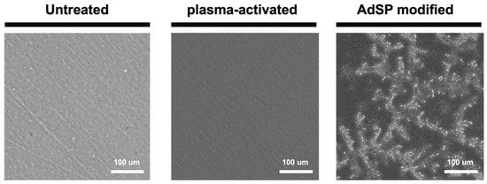 Surface images of the untreated non-adhesive dish, the plasma-activated dish, and the AdSP-modified dish observed by microscopy.