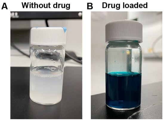 Photo images showing the suspension of composite nanoparticles based on AdSP and chitosan without model drug (A) and those loaded with drug (B).