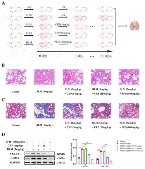 The rat model of BLM-induced PF has been widely used to explore the pathogenesis and potential novel therapies of PF [32]. PFD is one of two FDA-approved drugs for the treatment of PF, so it is often used as a positive control. Herein, after administering BLM to rats to induce PF, we treated them with CEP and PFD 24 h later for 21 consecutive days (Figure 1A). To investigate the effect of CEP on the lung tissue on a BLM-induced PF rat model, we examined the pathological changes in lung tissue and alterations in the levels of myofibroblast markers α-SMA and COL1A1 after 3 weeks. Compared with the control group, hematoxylin eosin (H&E) staining in the PF rats demonstrated that the alveolar septa and alveolar collapse had thickened (Green arrow) and H&E staining was accompanied by high granulocyte infiltration (Black arrow). Conversely, these symptoms were significantly relieved following 15 mg/kg CEP and 100 mg/kg PFD treatment, while 5 mg/kg CEP did not significantly improve BLM-induced lung inflammation (Figure 1B). Masson staining demonstrated proliferative deposition of blue collagen fibers in the lung of PF rats (Black arrow), which exhibited improvement after 15 mg/kg CEP and 100 mg/kg PFD treatment. However, 5 mg/kg CEP did not significantly improve BLM-induced lung collagen fiber generation in rats (Figure 1C). Next, we measured the α-SMA and COL1A1 expression using Western blotting, suggesting that 15 mg/kg CEP and 100 mg/kg PFD could effectively reduce the changes of protein levels, while 5 mg/mg CEP did not reduce the expression levels of these proteins (Figure 1D). Hence, these results suggest that 15 mg/kg CEP and 100 mg/kg PFD can ameliorate lung injury and collagen deposition in BLM-induced PF.