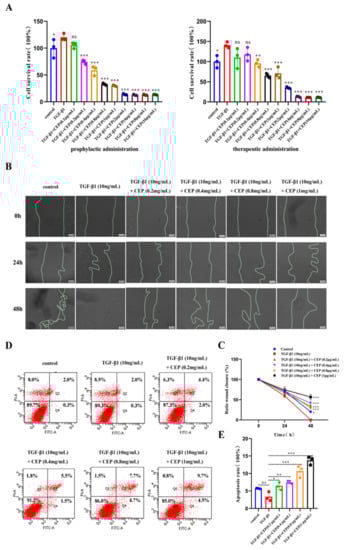 Effects of CEP on TGF-β1-induced apoptosis, viability, and migration of myofibroblasts in vitro. (A): Effect of prophylactic and therapeutic CEP administration on the survival rate of myofibroblasts as investigated with CCK-8 assay (“prophylactic administration” is to add different concentrations of CEP first, without removing CEP, then add 10 ng/mL TGF-β1 1 h later, and continue the culture 48 h; “therapeutic administration” is to add 10 ng/mL TGF-β1 for 1 h, without removing TGF-β1 for 1 h and then add different concentrations of CEP, and continue the culture 48 h.). (B): Effect of CEP on myofibroblast migration with wound-healing assay. (C): Image J software was used to quantify the area of wound (the area between two lines). (D): Effect of CEP on myofibroblast apoptosis with Annexin V-FITC/PI. Q1: Necrotic cell; Q2: Late apoptotic cell; Q3: Living cell; Q4: Early apoptotic cell. (E): The sum of the percentage of Q2 and Q4 regions of each group was analyzed. ns: no statistical difference, * p < 0.05, ** p < 0.01, and *** p < 0.001.