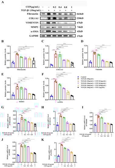 Our study showed that CEP inhibited TGF-β1-induced FMT; hence, we wanted to determine the regulatory role of CEP in TGF-β1-induced PF. Compared to cells from a control group, MRC-5 cells exposed to 10 ng/mL TGF-β1 expressed higher myofibroblast marker levels, including Fibronectin (Figure 3B), COL1A1 (Figure 3C), Vimentin (Figure 3D), Matrix Metallopeptidase 2 (MMP2) (Figure 3E), and α-SMA (Figure 3F), all of which are TGF-β1 profibrotic downstream effectors of the signaling pathway. However, Fibronectin, COL1A1 and Vimentin were reversed by CEP in a dose-dependent manner, except for 0.2 μg/mL CEP (Figure 3A–D), and their mRNA levels showed similar changes (Figure 3G,H,I), and α-SMA can be reversed by CEP in a dose-dependent manner (Figure 3A,F), and its mRNA level showed similar change (Figure 3K). It should be noted that MMP was also reversed in a dose-dependent manner except for 0.2 and 0.4 μg/mL CEP (Figure 3A,E), and its mRNA level showed similar change (Figure 3J). In general, however, CEP inhibits related effector factors in the FMT pathway. Therefore, CEP targets the FMT to inhibit fibroblast differentiation in vitro.
