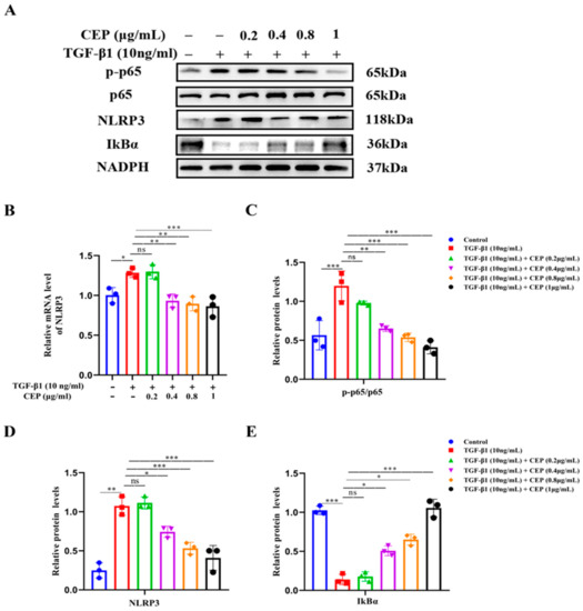 CEP suppressed TGF-β1-induced inflammation via the NF-κB/NLRP3 pathway in vitro. (A): Protein levels of NLRP3, phosphorylated p65 (p-p65), p65, and IκBα measured with Western blotting, respectively. (B): mRNA levels of NLRP3 measured with RT-qPCR. (C): The ratio of the amount of protein level in p-p65/p65 with gray value and Image J software was used. (D): NLRP3 protein level was quantified by grayscale value and Image J software was used. (E): IκBα protein level was quantified by grayscale value and Image J software was used. ns: no statistical difference, * p < 0.05, ** p < 0.01, and *** p < 0.001.