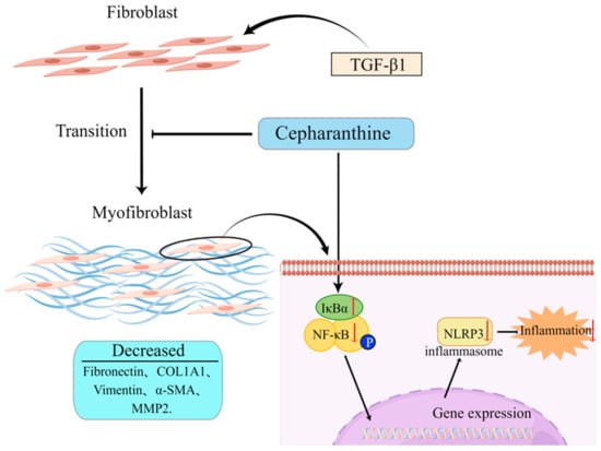 Among BBIQ alkaloids, CEP is the only approved drug for human use in Japan since the 1950s and has been used to treat a number of acute and chronic diseases, including leukopenia, snake bites, xerostomia, and alopecia [24]. Recently, CEP was reported to exhibit strong antiviral activity against COVID-19 [28,29,43]. Concurrently, the anti-inflammatory property of CEP enables its use in the treatment of cerebral ischemia/reperfusion injury, wherein CEP inhibits NLRP3 signaling, and caspase-1, thereby suppressing the overproduction of IL-1β and IL-18, thus attenuating cerebral ischemia/reperfusion injury [44]. Moreover, CEP ameliorates chondrocytic inflammation and osteoarthritis by regulating the MAPK/NF-κB-autophagy pathway [45]. CEP also inhibited NF-κB activation, IκBα degradation, and ERK, JNK, and p38 phosphorylation in lipopolysaccharide-stimulated RAW264.7 cells in vitro and lipopolysaccharide-induced lung injury model in a dose-dependent manner [46]. Our results show that CEP inhibited IκBα degradation, NF-κB phosphorylation, and the PF cascade by suppressing the activation of the NF-κB pathway. Moreover, CEP inhibited the activation of the NLPP3 inflammasome, thereby reducing the inflammatory response and avoiding the aggravation of PF by circumventing the cytokine storm.