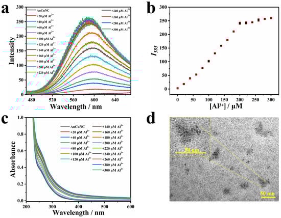(a) Fluorescence and (c) UV–Vis absorption spectra of AuCuNC@GSH (0.050 mg∙L−1) in the presence of different amount of Al3+ (0–300 μM) in MES-NaOH buffer (pH = 6.0); (b) the corresponding intensity changes at 585 nm (λex = 350 nm); (d) typical TEM image of AuCuNC@GSH (0.050 mg∙L−1) in the presence of Al3+ (200 μM).