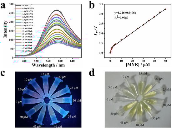 (a) Fluorescence spectra of AuCuNC-Al3+ (0.050 mg∙L−1, 200 μM) in the presence of different amounts of myricetin (MYR, 0, 0.50, 1.0, 1.5, 2.0, 3.0, 4.0, 5.0, 10, 15, 20, 25, 30, 35, 40, 45, 50 μM) in MES-NaOH buffer (pH = 6.0); (b) the corresponding intensity ratio changes at 585 nm (the initial intensity over the measured value, λex = 350 nm), and photograph of AuCuNC-Al3+ (0.050 mg∙L−1, 200 μM) in the presence of different amounts of myricetin (0–50 μM) in MES-NaOH buffer (pH = 6.0) under (c) UV light (365 nm) and (d) sunlight.