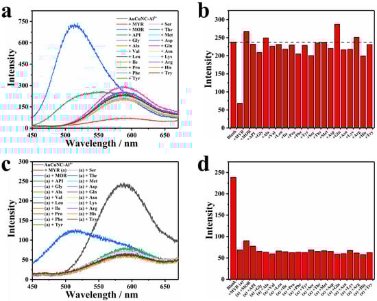(a) Fluorescence spectra and (b) the corresponding intensity changes (585 nm) of AuCuNC-Al3+ (0.050 mg∙L−1, 200 μM) in the presence of different kinds of amino acids (50 μM) and other flavonols in MES-NaOH buffer (pH = 6.0); (c) fluorescence spectra; and (d) the corresponding intensity changes (585 nm) of AuCuNC-Al3+ (0.050 mg∙L−1, 200 μM) in the absence and presence of myricetin (50 μM), and the mixture of myricetin and equivalent amino acids or other flavonols (50 μM) in MES-NaOH buffer (pH = 6.0; myricetin, morin, apigenin, glycine, alanine, valine, leucine, isoleucine, proline, phenylalanine, tyrosine, serine, threonine, methionine, aspartic acid, glutamine, asparagine, lysine, arginine, histidine, and tryptophan are abbreviated as MYR, MOR, API, Gly, Ala, Val, Leu, Ile, Pro, Phe, Tyr, Ser, Thr, Met, Asp, Gln, Asn, Lys, Arg, His, and Try, respectively).