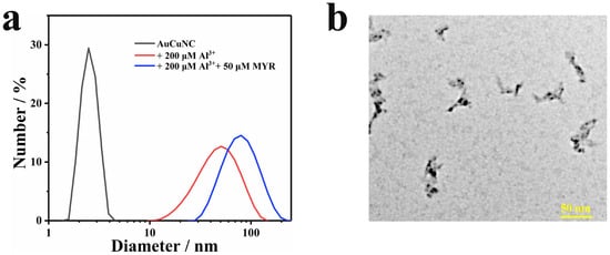 (a) Dynamic light scattering (DLS) of AuNCs@GSH (0.050 mg∙L−1) in the absence and presence of Al3+ (200 μM) and myricetin (50 μM); (b) typical TEM image of AuNCs-Al3+ (0.050 mg∙L−1, 200 μM) in the presence of myricetin (MYR, 50 μM).