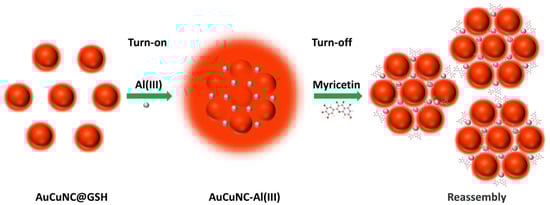 In the previous work, we prepared red-emitted bimetallic gold and copper nanoclusters (AuCuNC@GSH) by employing GSH as a reductant and stabilizing agent []. However, the low quantum yield of emission significantly limited their application, which needed further improvement. Because Al3+ has the advantages of high natural abundance and cheap availability, we used it to replace Ce3+. Al3+ was introduced to construct an assembly with AuCuNC@GSH, which resulted in a larger particle of AuCuNC-Al3+ and an obvious emission enhancement (>100-fold). However, the quenching of myricetin on AuCuNC-Al3+, linearly endowed, could be further used to detect myricetin, which showed high selectivity and excellent sensitivity for myricetin in aqueous solution. Moreover, the high accuracy for the myricetin-spiked grape juice ensured the practical application of the developed method. Particularly, the in-depth mechanism investigation, both on Al3+-induced assembly enhancement and the myricetin-induced quenching of emission, laid the foundation to develop more efficient fluorescent approaches for the detection of myricetin and other flavonols.