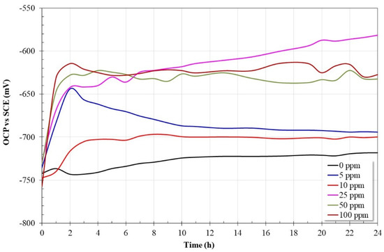 Once the optimal inhibition concentration was determined, potentiodynamic polarization curves were performed at different immersion times and temperatures. In all cases, for each polarization curve a new working electrode was used.