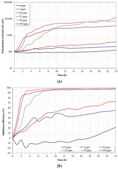 pi is the value of Rp in the presence of the inhibitor. From the figure in the absence of the inhibitor after an initial corrosion process, the formation or precipitation of corrosion products on the surface of the steel caused a decrease in its corrosion rate, observing a reduction close to 20% at the end of the test. However, with the addition of 5 and 10 ppm of the inhibitor, an inhibition efficiency of the order of 50–70% was obtained, but at higher concentrations the efficiency increased above 95%. The trend indicates that the maximum protection efficiency is reached with 25 ppm of the inhibitor with an inhibition efficiency of 99%. At this concentration, the greatest surface coverage is achieved, which limits the free contact of the electrolyte with the metal surface and makes diffusion through the protective layer the limiting step in the metal dissolution process [