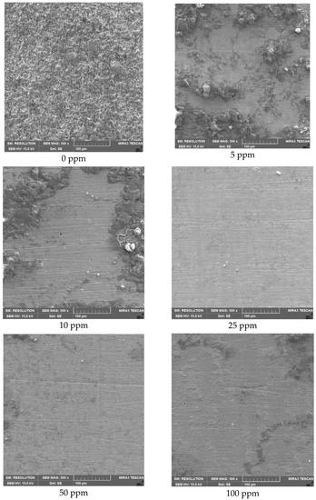 Figure 3 shows the morphological aspects of the clean surface of the evaluated steel in the presence of the different inhibitor concentrations. It is evident that the greatest damage observed corresponds to the condition in the absence of the inhibitor. At low concentrations of the inhibitor (5 and 10 ppm), the surface showed strongly adhered corrosion product residues, and at high concentrations (50 and 100 ppm) the concentration of residual corrosion products was lower. It is clear that at 25 ppm the surface of the steel is practically free of surface defects due to the corrosive action of the electrolyte.