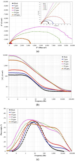 Figure 2a). On the other hand, according to the Bode diagram in its phase angle format, in the absence of an inhibitor, the formation of a time constant is detected, whose maximum is located around 10 Hz with a value of 63°. In the presence of an inhibitor, two-time constants are observed, where the first is in the high frequency region with a maximum phase angle between 45–50° for concentrations greater than 10 ppm, and between 1–10 Hz the presence of the second time constant is noted, with a maximum phase angle around 67° with the addition of 25 ppm of the inhibitor. Due to the location of the first time constant (high frequency region) it can be associated with the formation of a thin layer of the inhibitor molecules onto the steel surface, and because in the low frequency region the angle of phase tends to 0°, it can be suggested that the inhibitor film is dense, which significantly reduced the diffusion of aggressive species of the electrolyte towards the metal surface.
