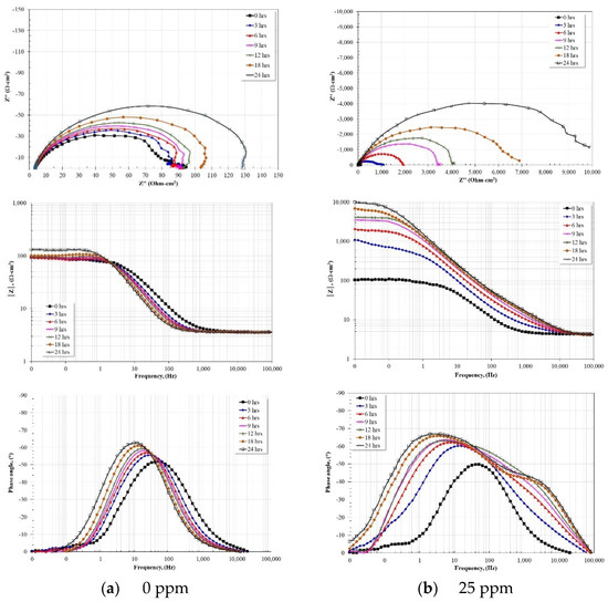 f, whose extension increases with immersion time from 10 Hz to approximately 0.1 Hz. In the low-frequency region, the low-frequency plateau is observed, whose magnitude of the impedance modulus increases with immersion time up to approximately two orders of magnitude at the end of the test. This increase is due to the increase in resistance to load transfer due to the adsorption and formation of a protective film on the steel surface. From the Bode diagram in its phase angle format, in the high frequency region the formation and evolution of the first-time constant associated with the protective layer of the inhibitor adsorbed on the steel surface is observed. Its location is around 2 kHz, reaching a maximum phase angle of 42° after approximately 24 h of immersion. The presence of this time constant is also a characteristic of organic inhibitors with a hydrophobic group formed by a hydrocarbon chain [
