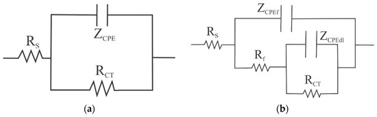 Figure 8 shows the equivalent circuits proposed to model the electrochemical behavior of the X52 steel, both in the absence and in the presence of the corrosion inhibitor. In this case, Rs represents the electrolyte resistance, Rct the charge transfer resistance, Rf the resistance of the adsorbed inhibitor film, Z