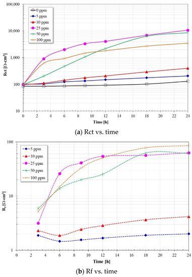 Figure 9b the Rf values are lower than those of Rct, and its value is higher at concentrations greater than 10 ppm, reaching maximum values between 60–80 ohms-cm