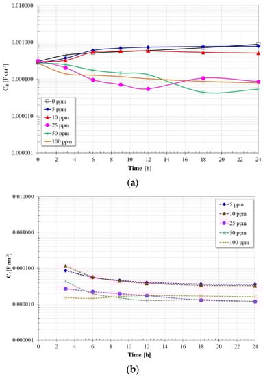 Figure 10a, in the absence of the inhibitor, the Cdl values show an increase with immersion time, however, for concentrations of 5 and 10 ppm, the Cdl values show approximately the same values as in the absence of the inhibitor. At concentrations greater than 10 ppm, the Cdl values are lower and tend to decrease with immersion time until reaching approximately the same value. The trend of these values is inversely proportional to the values of Rct, that is, as the values of Rct increase, the values of Cdl tend to decrease. Furthermore, according to the Cdl definition: