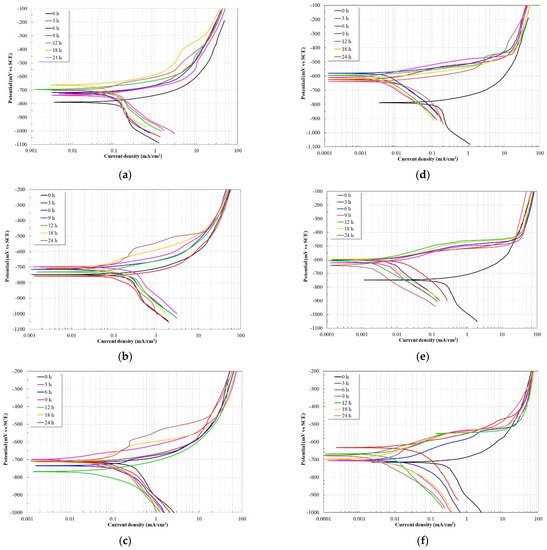 Figure 11c), the polarization curves show a slight shift to lower current densities but with oscillations in its corrosion potential, being more active at 3 and 12 h. Until 12 h, the anodic branch shows an active corrosion process and after 18 h an increase in the slope of the anodic branch is observed, which may correspond to the formation of protective corrosion products on the surface of the working electrode.