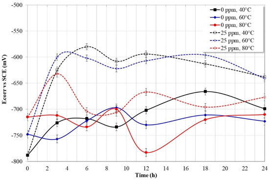 Figure 12 shows the variation in the Ecorr values obtained from the potentiodynamic polarization curves. In the absence of the inhibitor, it is observed that the Ecorr values are more active with increasing temperature, this indicates that the material becomes more susceptible to corrosion. However, in the presence of the inhibitor, Ecorr values tend to be more noble, indicating a tendency to protect. This is more evident at 40 °C and 60 °C, however at 80 °C oscillations in the Ecorr values are observed, possibly due to adsorption–desorption processes of the inhibitor molecules.