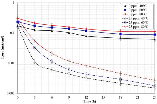 Figure 13 shows the variation in the Icorr values, obtained from the potentiodynamic polarization curves, as a function of time and temperature. From the graph in the absence of the inhibitor the steel shows Icorr values of the same order of magnitude regardless of the test temperature, with a tendency to decrease with immersion time and increase with temperature. On the other hand, in the presence of the inhibitor, it is observed that the Icorr values tend to decrease by more than one order of magnitude in the first 3 h of immersion and subsequently remain in the same order of magnitude regardless of the temperature. Since the values of Icorr are inversely proportional to the resistance to polarization (Rp), it is observed that the trend in the values of Icorr adjusts to that observed with the values of Rp (