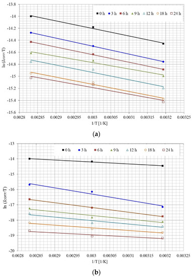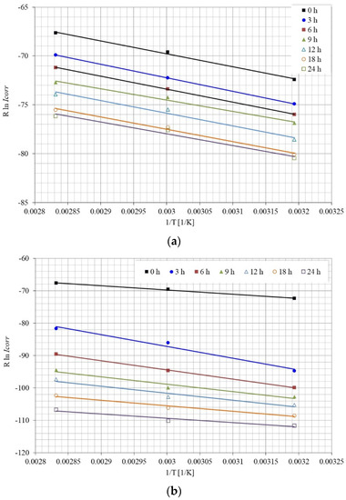The effect of temperature on the corrosion process can be explained with the use of the Arrhenius equation, where the activation parameters of both the anodic branch and the cathodic branch can be calculated by means of the following equation [