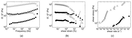 Mechanical spectra (a), dynamic stress sweeps (b) and flow curves (c) performed on biomass premixes with distilled water: 50 g with 50 mL (triangles) and 30 g with 70 mL (squares). In (a,b): G’ is displayed as open symbols; G” is displayed as filled symbols. Arrows in (b) indicate the strains where slurries are fluidized, whereas lines in (c) are fits of Equation (1) to the data.