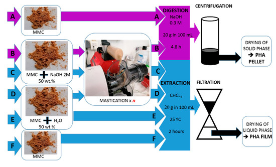 Flow chart of the downstreaming protocols used for digestion with 0.3 M NaOH or extraction with CHCl3. The dried biomass (MMC) containing 50 wt% PHA was processed using routes A to F, yielding eight samples in the form of pellets (digestion, samples A and B) or films (extraction, samples C to F). Samples C1 and D1 were masticated with n = 1, whereas samples B, C5 and D5 were masticated with n = 5.