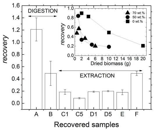Product recovery achieved for all processed biomasses. Samples produced for benchmarking are: A for digestion with NaOH, and E and F for extraction in CHCl3. Inset: product recovery as a function of the dried biomass weight used for the extraction with CHCl3 of MMC PHA.