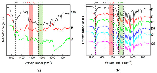 where T1720 is the intensity of the C=O band and T1540 is the intensity of the amide II band. The APHA of all films and pellets are reported in Table 2. As expected from the recovery data (see Figure 3), the lowest APHA values were computed from the DRIFT spectra of samples A and B. Thus, digestion with NaOH produced PHA with significant amounts of residues, which was expected because similar trends were noted for wet biomasses [35] or other biomasses with similar PHA content [26]. The FTIR analysis shows that mastication was effective in reducing the amount of non-PHA residues in the extracted films. This was not simply due to the presence of water in the biomass because sample E does not show a better APHA than sample F. Pretreating the biomass with NaOH prior to mastication led to a significant drop in the purity of the recovered PHA films. Note here that the low APHA values are not related to the use of DRIFT to acquire the spectra. Figure 4a shows a DRIFT spectrum of an MMC PHA produced from cheese whey using the same protocol as the one used in the present study [45]. This spectrum (labelled as CW in Figure 4a) is qualitatively similar to the other two DRIFT spectra, and the ratio APHA computed from the bands’ intensities is 0.82. The latter is comparable to the APHA values computed from the FTIR spectra of samples E and F and is in line with the 89 % purity estimated from the TGA of this biopolyester [45].