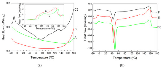 The thermal properties measured with DSC are illustrated in Figure 6, which displays representative second heating curves. These curves present all thermal transitions reported for PHBV copolymers (see [45,48] and references therein), and the corresponding temperatures are reported in Table 2 for all samples. Starting from the lower temperatures, the glass transition ranged between Tg = −14 °C and Tg = −7 °C, the crystallization from the amorphous phase formed during the quenching of the melt was observed for all samples except the pellets at temperatures between Tc = 43 °C and Tc = 80 °C and the melting of the HV and HB crystals (2 distinct peaks) was seen at temperatures ranging from Tm = 100 °C to Tm = 157 °C.