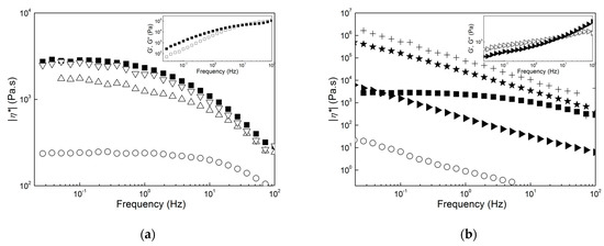 Mechanical spectra (dynamic shear viscosity |η*| as a function of frequency) measured at 170 °C. (a): Sample F (squares), sample E (circles), sample D1 (up triangles) and sample D5 (down triangles); (b): sample F (squares), sample C1 (circles), sample C5 (left triangles), sample B (stars) and sample A (crosses). Inset in (a): mechanical spectrum (storage modulus G’ (solid symbols) and loss modulus G”(empty symbols) as a function of the frequency) of sample F. Inset in (b): mechanical spectrum of sample C5.