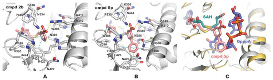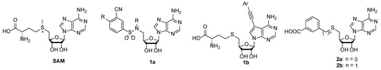 2-Methoxy-5-((adenosyl)thio)benzoic acid (10d): Synthesized following general procedure P4 from 8a (70 mg, 0.14 mmol), yielded 22 mg, 35%, as a white solid. HPLC purity 97%. See the following: 1H NMR (400 MHz, DMSO-d6) δ 12.75 (br s, 1H), 8.34 (s, 1H), 8.15 (s, 1H), 7.63 (d, J = 2.5 Hz, 1H), 7.53 (dd, J = 8.7, 2.5 Hz, 1H), 7.28 (s, 2H), 7.06 (d, J = 8.7 Hz, 1H), 5.88 (d, J = 6.1 Hz, 1H), 5.49 (d, J = 5.1 Hz, 1H), 5.35 (br s, 1H), 4.81 (q, J = 5.0 Hz, 1H), 4.20–4.11 (m, 1H), 3.94 (ddd, J = 7.2, 6.0, 3.3 Hz, 1H), 3.79 (s, 3H), 3.33 (dd, overlapped with water, 1H), and 3.22 (dd, J = 13.7, 7.2 Hz, 1H); 13C NMR (100 MHz, DMSO-d6) δ 167.2, 157.6, 156.6, 153.1, 149.9, 140.5, 135.7, 133.1, 125.9, 122.7, 119.7, 113.9, 87.9, 83.3, 73.1, 73.0, 56.4, and 37.7. HRMS (ESI/TOF-Q) m/z: [M + H]+ calcd. for C18H20N5O5S, 434.1129; found, 434.1136.