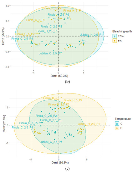 Principal component analysis (PCA) of the loading plot and score plots of data from the fatty acid profiles of bleached hemp oils, where: (a) grouped oil type; (b) grouped amounts of BE; (c) grouped temperature of pressed seeds.
