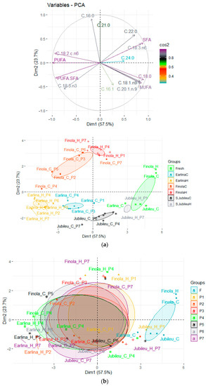 Two methods, MANOVA and PCA statistical analysis, were used to analyze the results. PCA analysis was performed using the program RStudio (version 2022.07.01 + 554 with the packages FactoMineR v.2.4 and factoextra v.1.0.7). Statistical analysis was performed using MANOVA (multivariate analysis of variance; multivariate Wilks test; Statistica 13.3 (StatSoft, Cracow, Poland). A p-value < 0.05 was considered to indicate a statistically significant difference. Chromatographic data (fatty acid analysis) and LHI values are presented as the mean ± SD (n = 3)