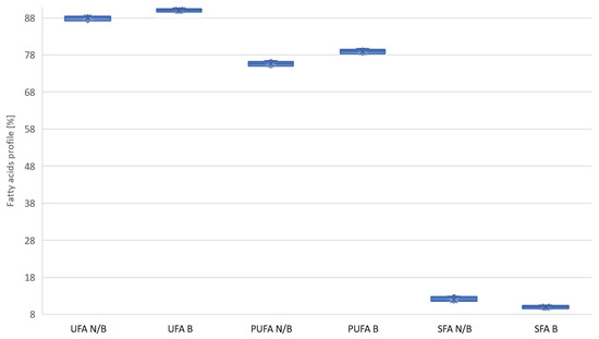Change in the proportions of SFA, PUFA, and UFA acids after the oil bleaching process. N/B—unbleached oil; B—bleached oil.