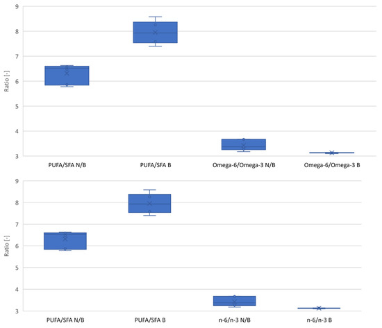 Change in the SFA/PUFA and omega-6/omega-3 ratios due to the bleaching process. N/B—unbleached oil; B—bleached oil.