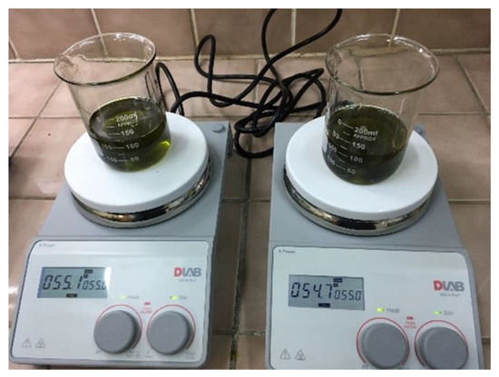 Bleaching was performed on a laboratory scale. A total of 100 ± 0.01 g of oil was taken. The oil was stirred with simultaneous heating to 50–60 °C. After the minimum temperature was reached and stabilized, 2.5 ± 0.05 g or 5 ± 0.05 g of bleaching earth was poured in. The mixture was stirred for 10 min at a constant magnetic stirrer speed of 550 rpm (Figure 5).